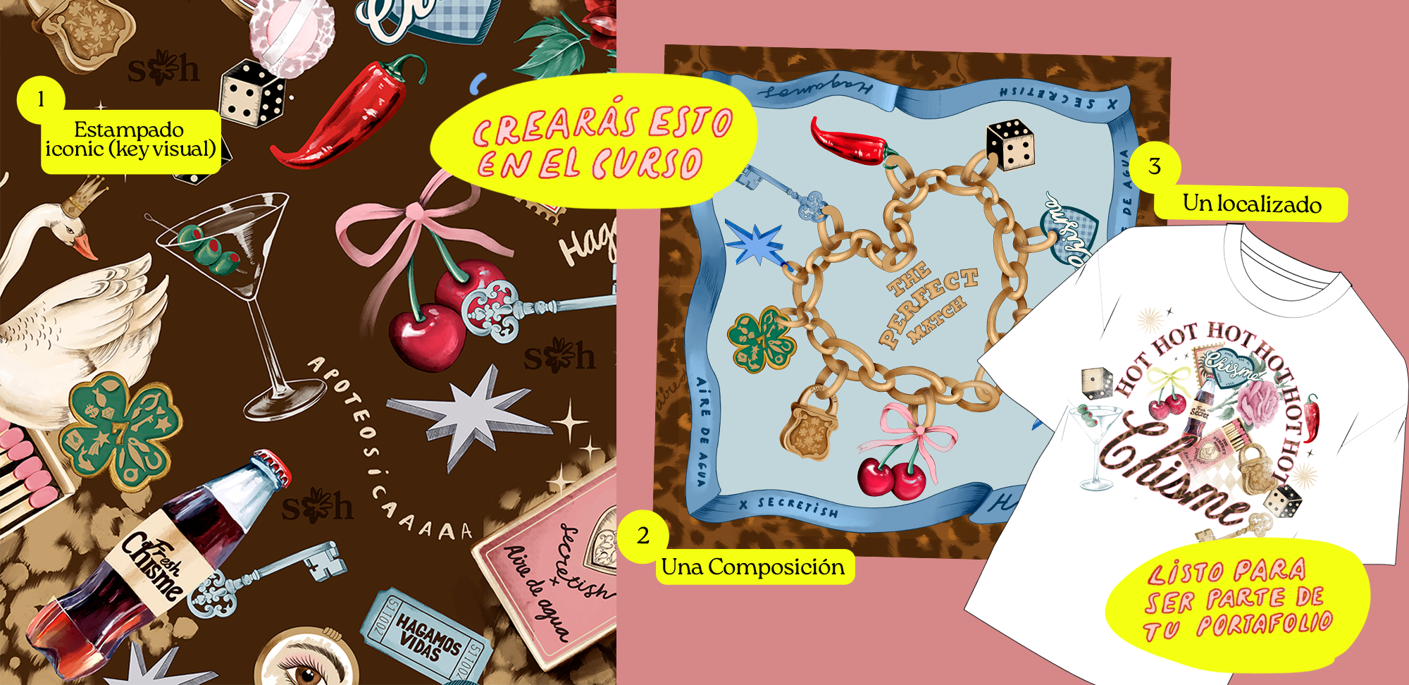 A partir de tu key visual, aprenderás a crear estampados localizados y nuevas composiciones para distintos productos.